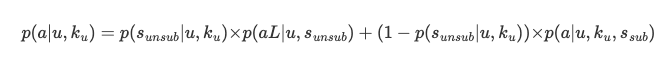 p(s | u,ku) is the probability of user performing action s in the week, given notification volume ku. In addition, p(a | u,ku,s) is the estimate of user activeness a given notification volume ku and action s. To simplify the model, they considered only two possible user actions: unsubscribe sunsub or continue to subscribe ssub. With these two actions, the reward function can be simplified into the following: