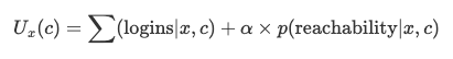 To balance between DAU (proxied via logins) and reachability, they weighted both via parameter a. Given features x and push cap c, the reward function for utility is defined as: